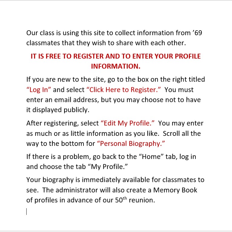 "Thanks to classreport.org our class website played a huge part in the success of our Reunion. We greatly appreciate your wonderful support."